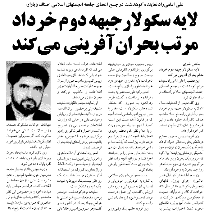 البته، اين جمله پيش از آنكه از دهان رهبر و در ارتباط با كنگره جبهه مشاركت ايران اسلامی بيرون بيآيد در روزهای پيش از اين سخنرانی در دو روزنامه كيهان و رسالت، با همين عبارت چندبار تكرار شده بود و رهبران موتلفه اسلامی نيز در دوران اخير و در تاكتيك فشار به خاتمی جهت راه يافتن به كابينه وی آن را به اشكال مختلف مطرح كرده بودند. در واقع رهبر سخنان آن آقايان موتلفه و نوشته‌های آقايان شريعتمداري، مرتضی نبوی و محبيان و انبارلوئی را تكرار كرد. اين تائيد يك بار ديگر مهر تائيدی بر سخنان خانم حقيقت جو در مجلس و مفاد نامه محسن سازگارا خطاب به رهبر گذاشت كه در آن‌ها مسئله ملاقات‌هاي منظم رهبر با حسين شريعتمداري سرپرست موسسه كيهان و نقش مشورتی وی در بيت رهبری را طرح كرده بودند.
