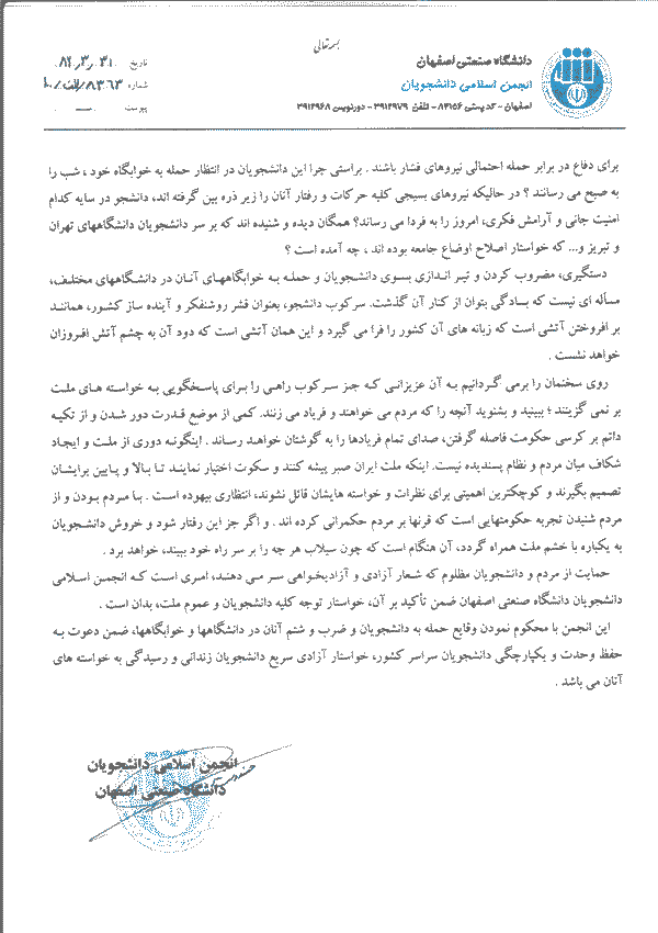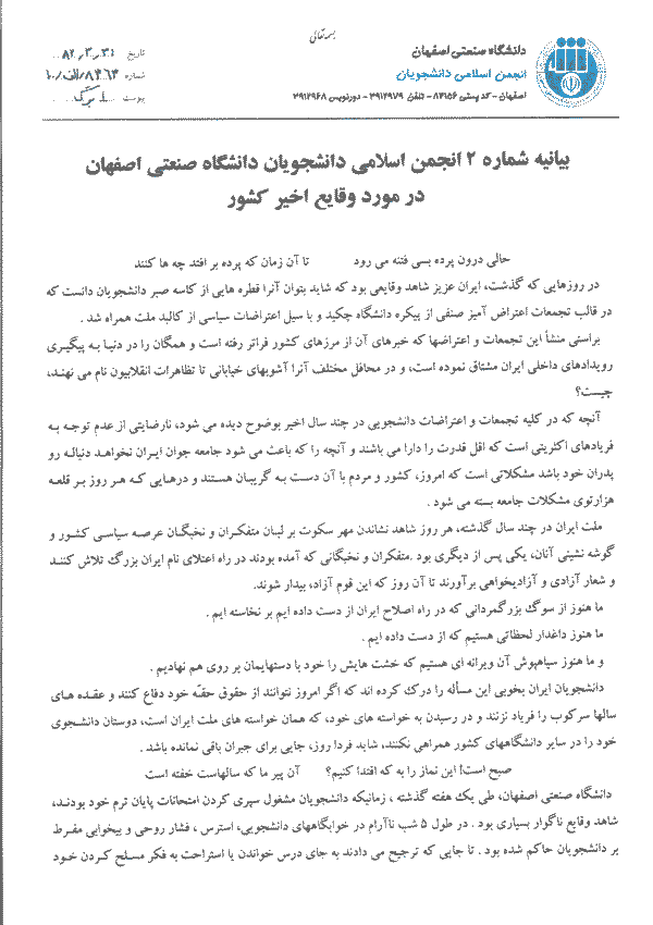 بيانيه انجمن اسلامی دانشگاه صنعتی اصفهان: