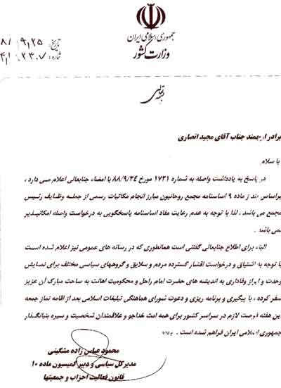 و شیخ مهدی کروبی نیز جداگانه از وزارت کشور تقاضای مجوز