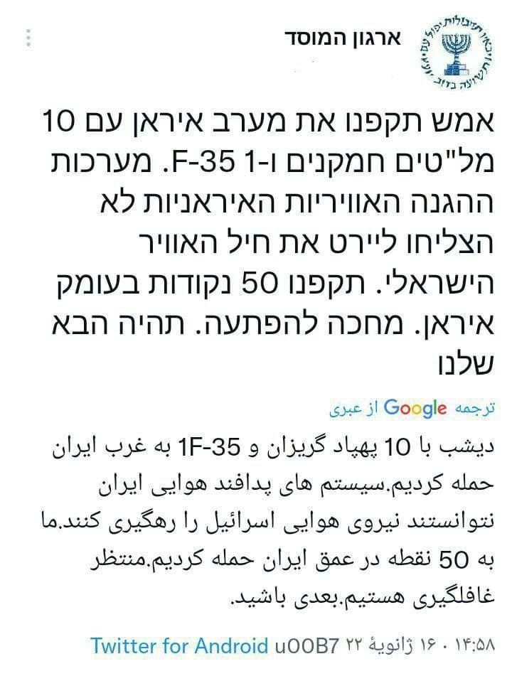 ایران بالاخره از اسرائیل در آمد و این توئیت به زبان عبری